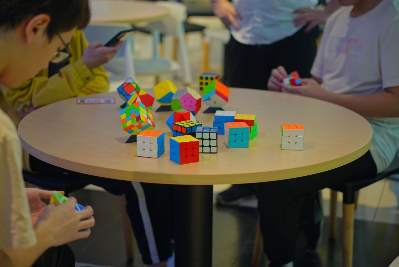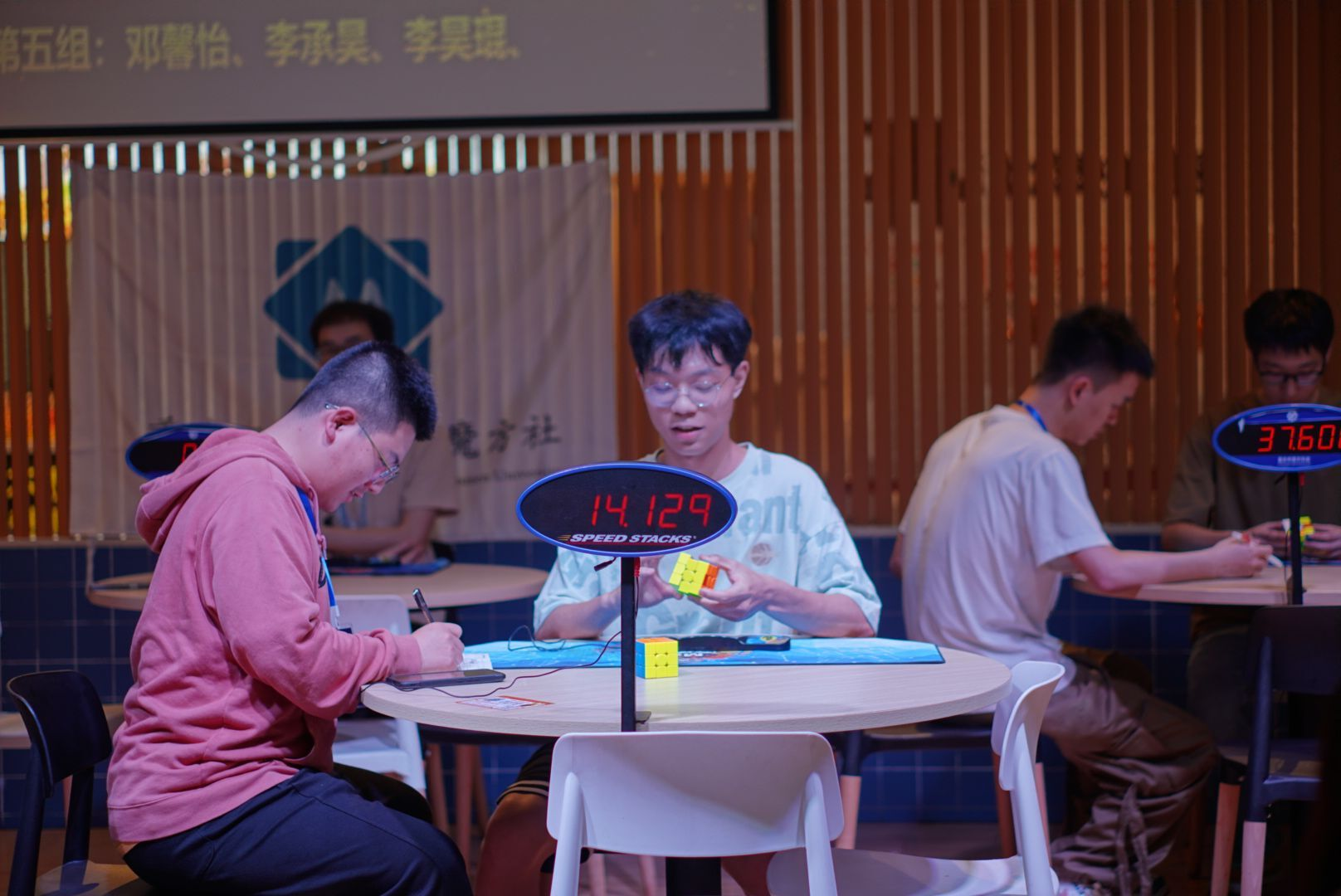 下午两点,比赛在同学们高涨的热情中拉开了帷幕,参赛者在 工作人员的安排下有序的进行抽签分组,同时由专门打乱魔方的同 学按公式打乱魔方,在具体的工作人员分配到比赛桌上,选手到 位,准备就绪后由裁判宣布开始,并计时,同学们,在比赛过程 中,沉着冷静,也并没有做出违规行为,比赛现场环境十分热情, 参赛者还原魔方后示意裁判,同时裁判完成计时,参赛者中有人在 短短几秒钟内就还原了魔方,还有许多只花了十几秒的优秀参赛 者,最终选出了一、二、三等奖的获得者,并由M魔方社会⻓王科文及管理人员为获得者颁发了奖状和奖品。
