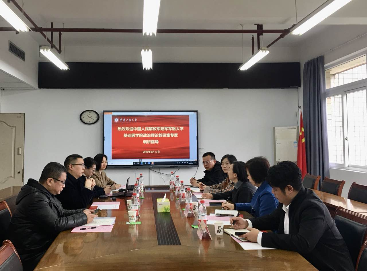 3月13日上午,中国人民解放军陆军军医大学基础医学院政治理论教研室主任张珊教授一行来beat365亚洲版官网调研,并召开交流座谈会。beat365亚洲版官网院长刘富胜,党委副书记、纪委书记、副院长洪富忠,相关教研部主任等陪同调研。