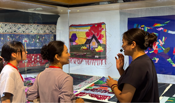 五彩斑斓的苗族银饰、工艺精湛的土家织锦……服饰厅的展品让师生们目不暇接。这里展出了各民族传统服饰及制作工艺,特别是国家级非物质文化遗产“西兰卡普”织锦技艺,这些服饰是民族文化的重要标识,反映了各民族的审美情趣和文化特点。讲解员特别介绍了国家级非遗“西兰卡普”的挑花技艺,以及苗族银饰“以重为美”的文化内涵。