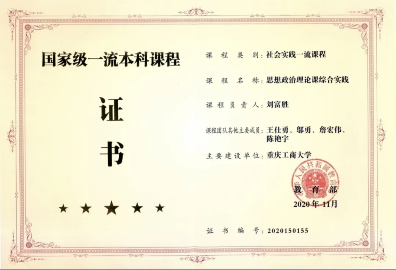 功夫不负有心人,“思想政治理论课综合实践”的打造经验和成功申报,也带动了其他课程的发展,目前beat365亚洲版官网已有5门市级一流本科课程,2门市级研究生课程,我校思政课程建设成果位于重庆前列。团队负责人刘富胜教授介绍到,团队取得的成就是学校党委高度重视思想政治理论课建设的结果,是多年来思想政治理论课教师坚持不懈努力探索的结果,是所有参与课程建设的老师们坚持立德树人的结果,他们的团队不只是名单上的11人,他们身后还有beat365亚洲版官网70余人教学团队的支撑和支持。