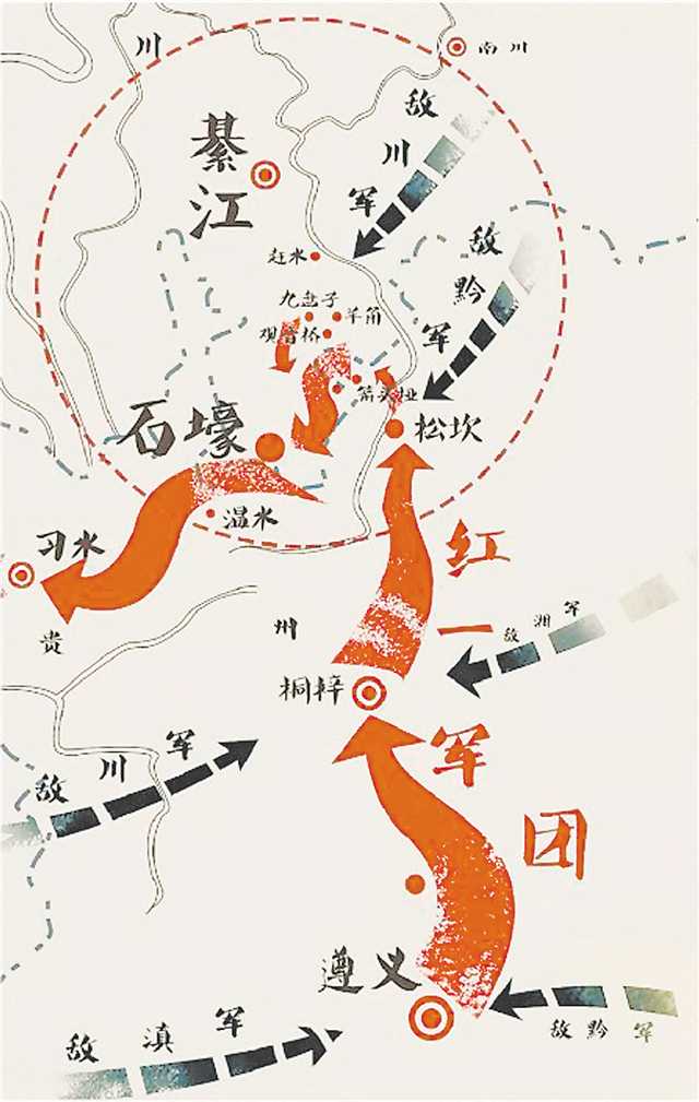 1月21日,红一军团直属队和第一、第二师8000多人,从松坎出发,经箭头垭和黑镜塘,于当天下午到达石壕。1月22日凌晨,部队开拔,经梨园坝向贵州温水、良村、东隍等地进军赤水。