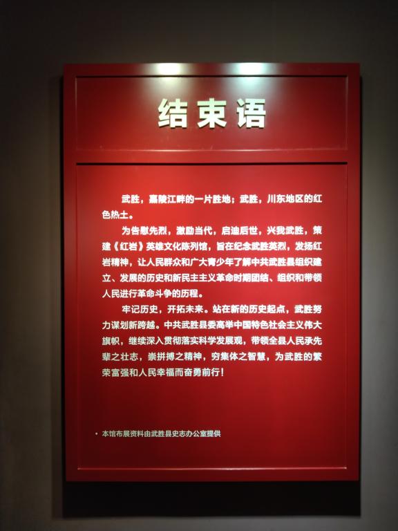 武胜县白坪乡白坪村是《红岩》作者杨益言的故乡,杨益言于1925年11月18日出生在此。红岩英雄文化陈列馆展厅以《红岩》文化为引子,着重展示武胜红色文化,旨在纪念武胜英烈,发扬红岩精神。