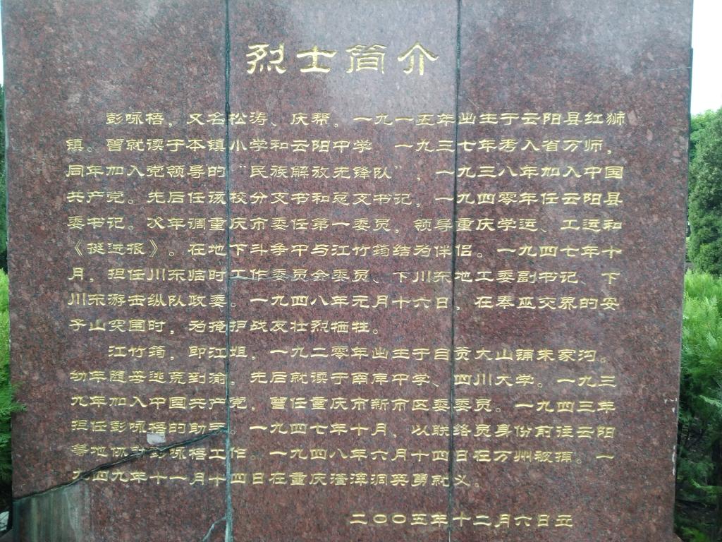 彭咏梧(1915年~1948年1月16日),1938年加入中国共产党,先后中共省立万县师范学校分支书记和总支书记。1940年任云阳县委书记,次年调重庆市委任第一委员,负责组织宣传工作,领导重庆学运和挺进报。1945年,在地下斗争中与江竹筠结为伴侣。为迎接全国解放,1947年10月,党决定他担任川东临时工作委员会委员、下川东地工委副书记,并到下川东组织领导武装斗争任游击纵队政委。1948年1月率游击队在奉、巫交界地暗洞包突围时,为掩护同志壮烈捐躯。