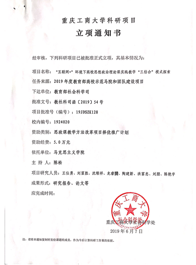 教育部思政课教学方法改革项目择优推广计划:“互联网”环境下高校思想政治理论课实践教学“三结合”模式探索(本成果申报人刘富胜、王仕勇、陈艳宇等)