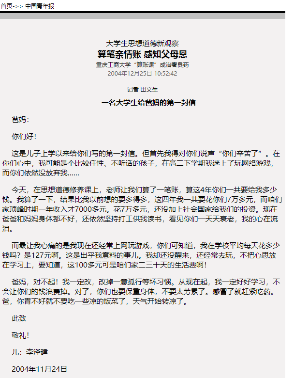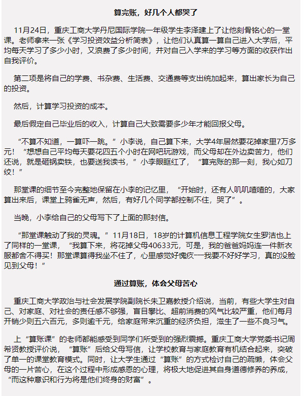 《中国青年报》“算笔亲情帐、感知父母恩”beat365亚洲版官网算账课成治愈良药