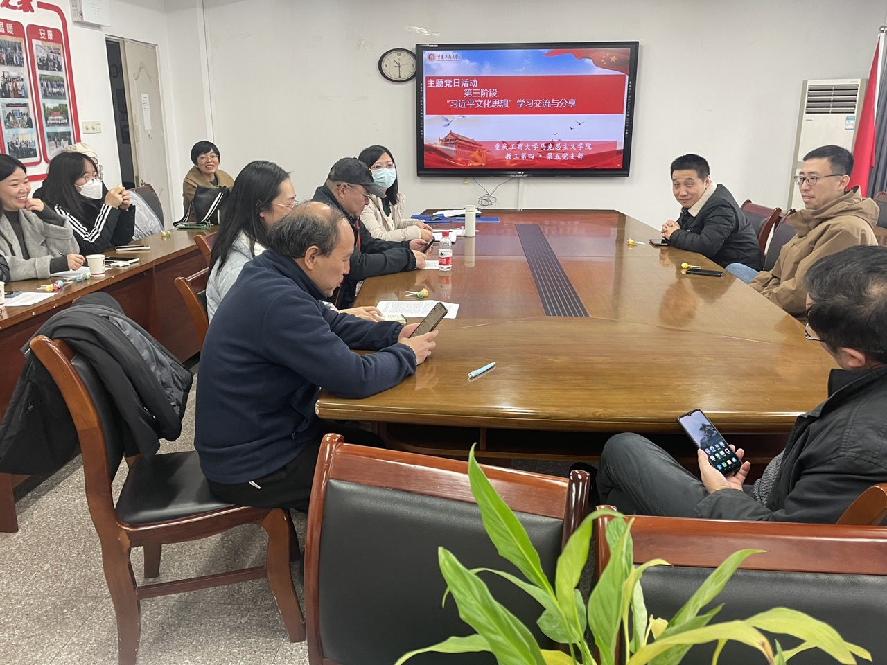 最后,党员同志们围绕习近平文化思想展开交流讨论与分享。张维贵教授、黄伟教授、杨华副教授、钟周铭副教授分别从习近平文化思想提出的背景、理论内涵、重要意义等方面进行了交流分享。大家一致认为,习近平文化思想作为习近平新时代中国特色社会主义思想的文化篇,是内容丰富、内涵深刻、内在统一的思想体系。作为一名思政课教师,在学深悟透的基础上,应积极有效地将习近平文化思想融入日常教育教学和科研工作中。