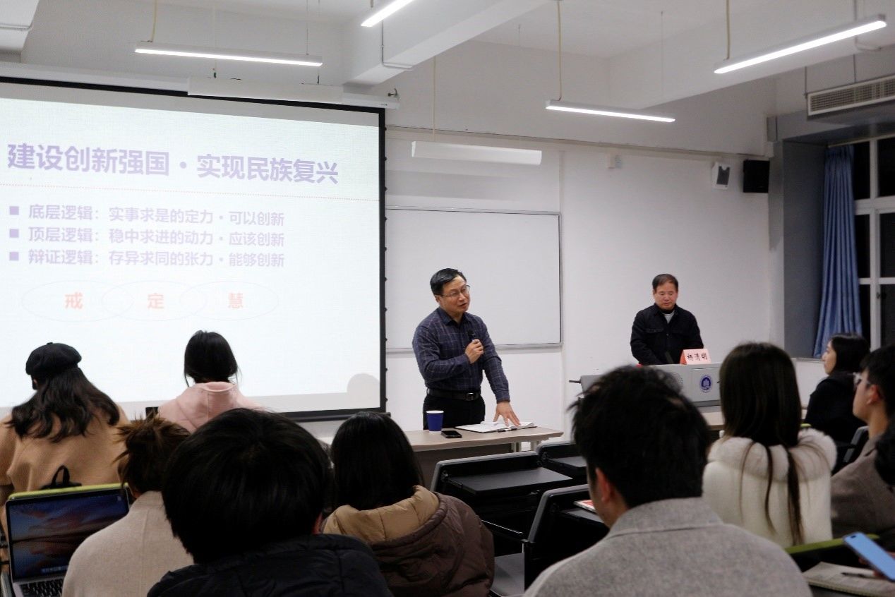 在讲座中,杨清明教授以“创新是体外进化”和“创新有主体要求”两个话题开场,引出“关于创新问题的三点思考”这一主题,并从三个方面进行阐述。一是创新的底层逻辑及本体论定力,他强调树牢唯物史观,强化理论思维和历史思维,深化对规律的认识,指出创新要从具体实践开始,从本体论的角度得出创新需要明确主观可以把握客观的结论。二是创新的顶层逻辑及认识论动力,他指出要树立大历史观,从历史长河、时代大潮、全球风云中分析演变机理,探究历史规律,并以“舆论导向的整体叙事与个体效应“为例,强调问题导向的重要性。三是创新的辩证逻辑及方法论张力,他强调坚持用唯物主义认识历史,坚持实事求是的思想路线,分清主流和支流,坚持真理,修正错误,发扬经验,吸取教训。杨教授指出,创新的底层逻辑是实事求是的定力,明确可以创新;创新的顶层逻辑是稳中求进的动力,明确应该创新;创新的辩证逻辑是求同存异的张力,明确能够创新。