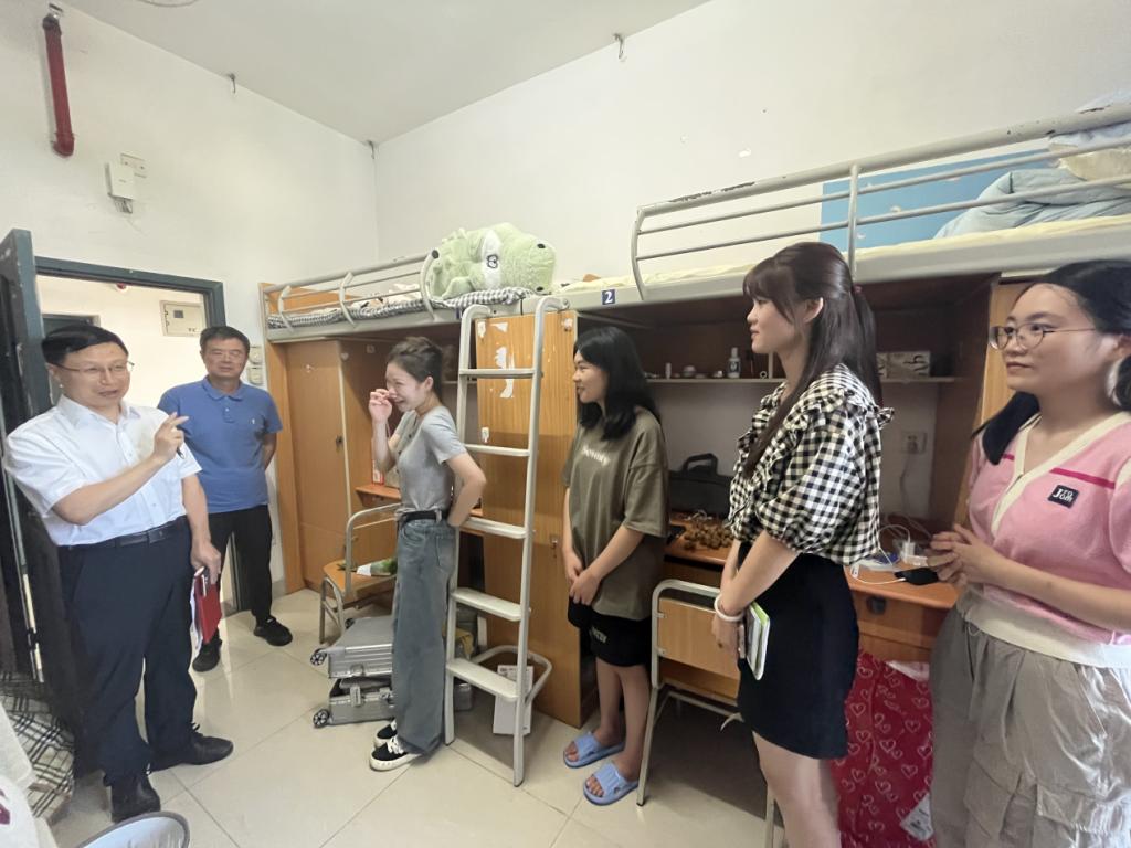 为进一步了解2023级新同学的思想动态、住宿环境、生活适应性情况,加强新生宿舍管理,帮助新生尽快适应新环境、新生活,9月5日下午,学院院长杨维东、副院长简福平、学工班主任周琴、辅导员敬德深入新生寝室,为同学们送去温暖、关怀。