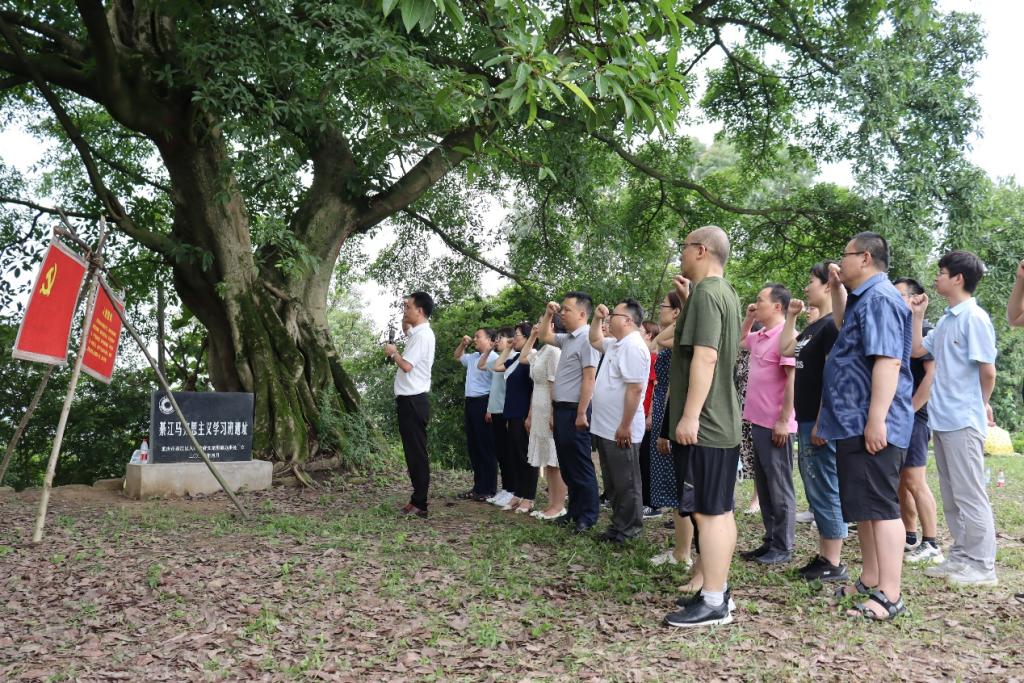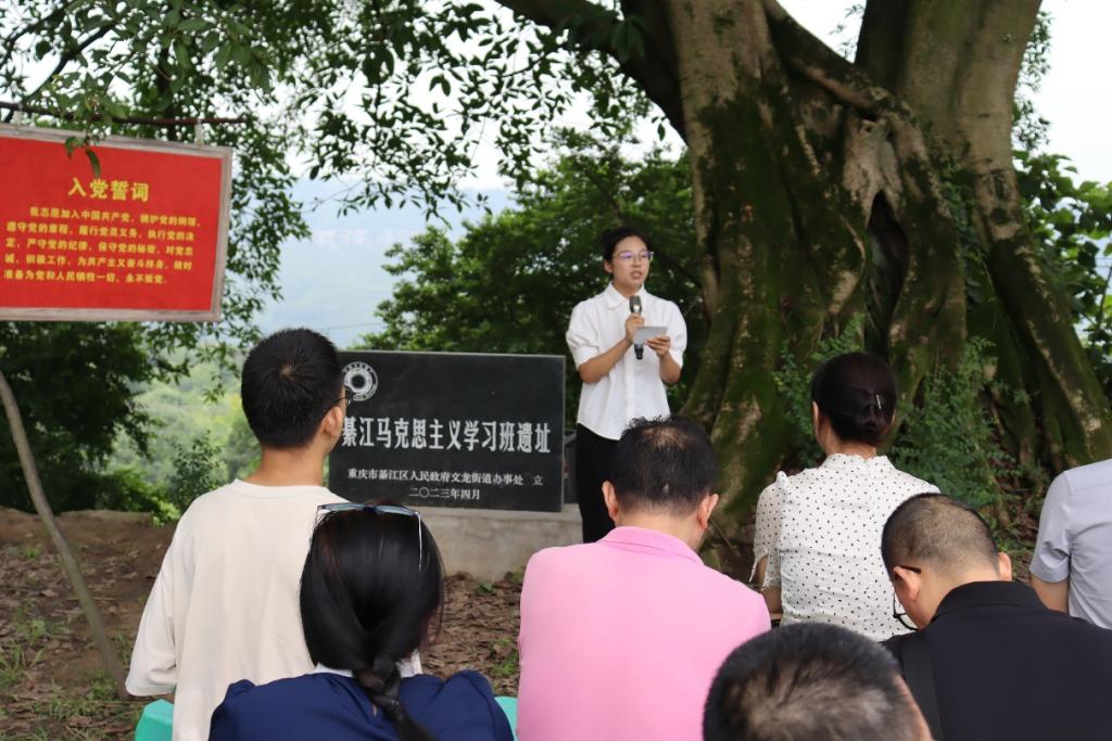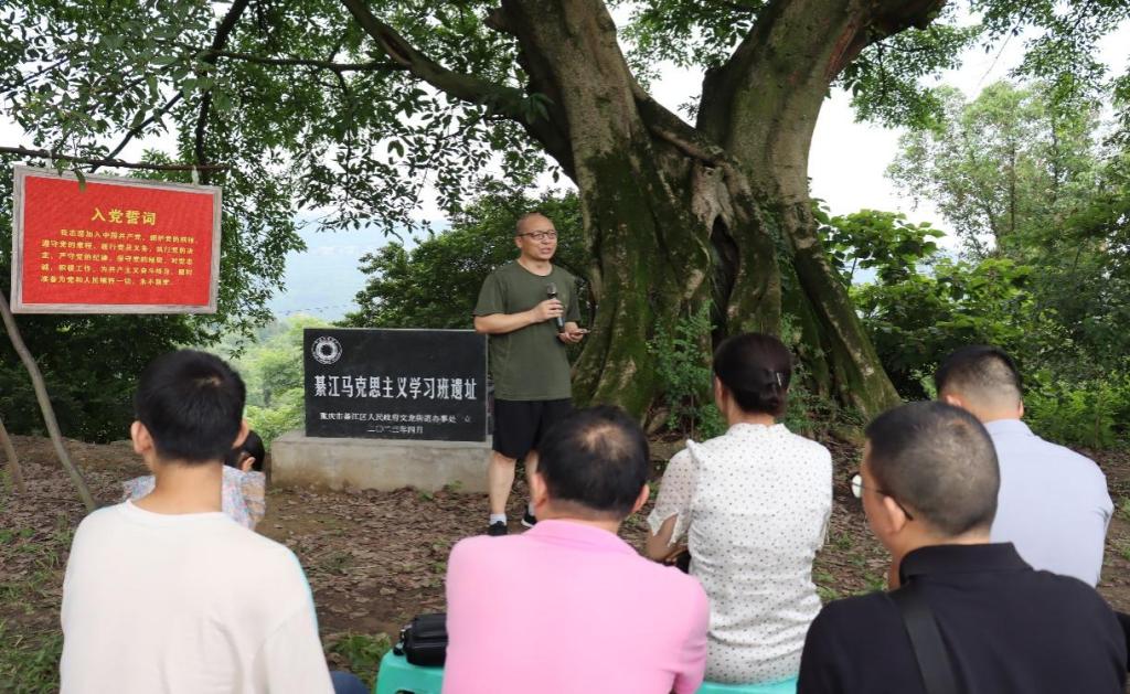 在重庆唯一的且重庆最早的马克思主义学习班遗址——綦江马克思主义学习班遗址,重庆市綦江区人民政府文龙街道办事处主任代显锋介绍了“黄葛树下学理论”活动开展的情况和展望;红军长征纪念馆朱艺华讲述了黄葛树下的故事;支部党员陈晓钢教授带来了以“诗、史、物三结合的思政课教学资源建设”为主题的党课,他基于诗言志、词传情、读史可以知兴替,就诗的选择、史的选择和物的选择三个方面进行了讲述,实现以激情、史实、实景增强理论阐释的生动性和说服力。大家纷纷表示,作为一名党员,要赓续红色血脉,永远跟党走,发挥模范带头作用;作为一名思政课教师,要将党的辉煌历史融入教学,讲深、讲透、讲活道理。
