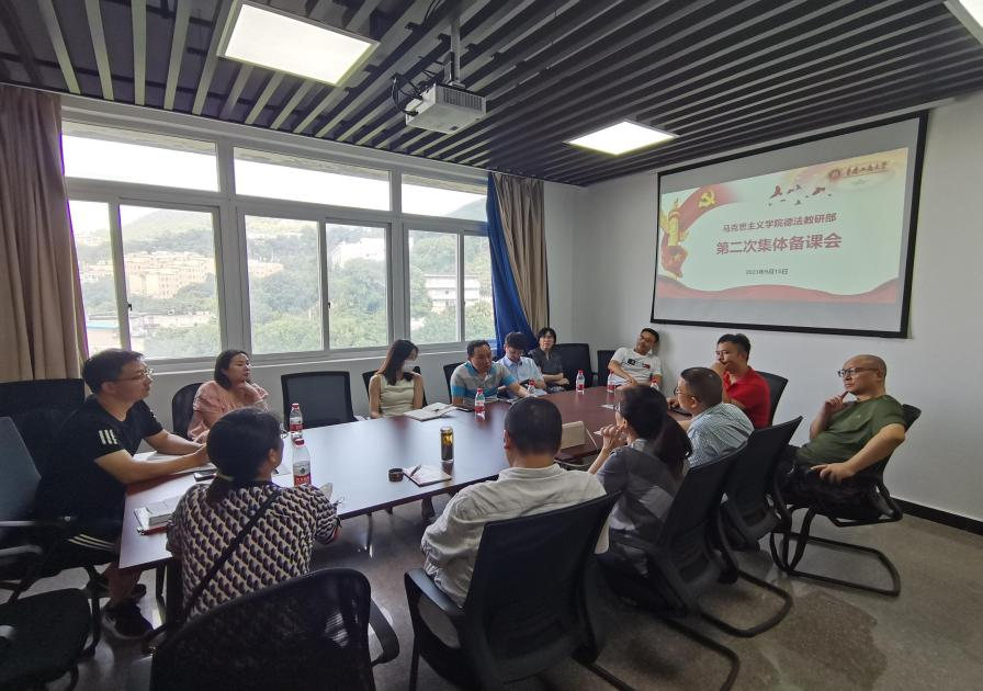 为了准确把握《思想道德与法治》2023年版新教材的指导思想、基本精神和主要内容,9月15日下午,思想道德与法治教研部在慧智楼90910会议室召开了第二次“立德垂范”集体备课会。本次会议由教研部主任董骏主持,德法教研室全体教师参加。